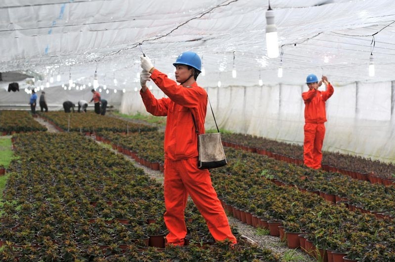 浙江省桐鄉(xiāng)市石門鎮(zhèn)白馬塘村農(nóng)業(yè)科技種植園,桐鄉(xiāng)市供電局石門供電營業(yè)所員工深入花卉茄大棚,幫助檢查設(shè)備和線路,安裝節(jié)能燈,保障用電安全,助力白馬塘村民增收。