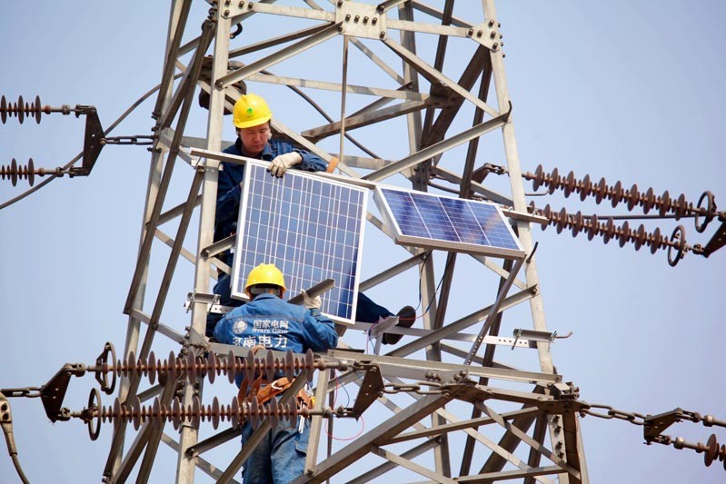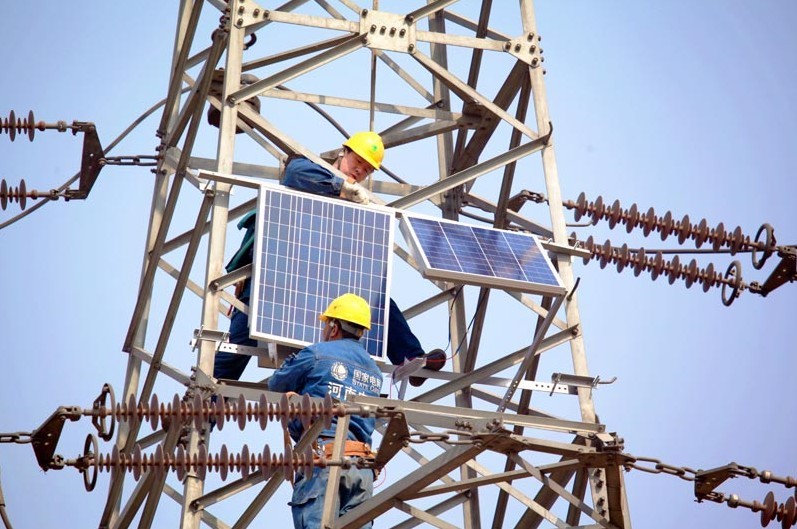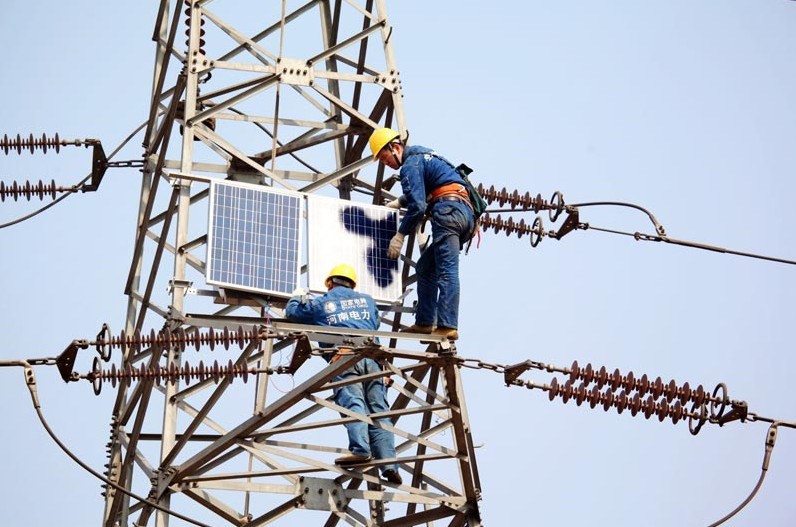 河南安陽(yáng)供電公司輸電運(yùn)檢部將10組遠(yuǎn)端監(jiān)視裝置安裝到幾條鄰近施工作業(yè)、商品房建設(shè)區(qū)域的220千伏和110千伏輸電線路上,用高科技“千里眼”盯緊重點(diǎn)線路運(yùn)行安全。圖為工作人員正在110千伏崇永線9#鐵塔上安裝為監(jiān)視探頭提供動(dòng)力的太陽(yáng)能電池板。