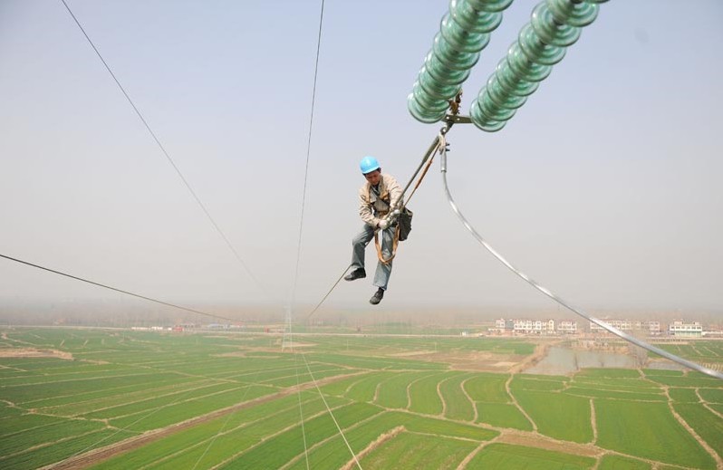 2013年3月7日,在安徽省滁州市定遠(yuǎn)縣永康鎮(zhèn)大唐村,電力工人在高空檢修供電線路。為保障春耕生產(chǎn)正常用電,國(guó)家電網(wǎng)安徽省滁州供電公司成立一支由技術(shù)骨干組成的“共產(chǎn)黨員服務(wù)隊(duì)”,對(duì)全市農(nóng)業(yè)生產(chǎn)線路、春灌電力設(shè)備等進(jìn)行了一次全面檢修維護(hù),同時(shí)專門開辟農(nóng)業(yè)用電“綠色通道”,為群眾破解用電難題,確保春耕生產(chǎn)可靠用電。