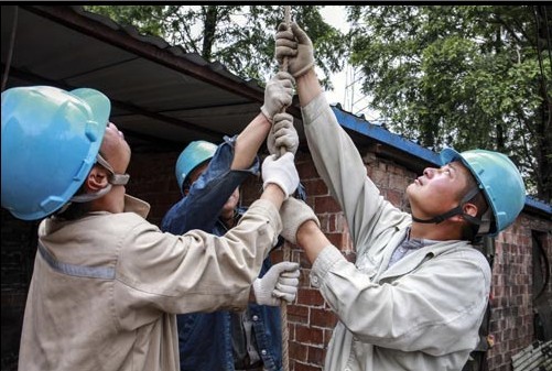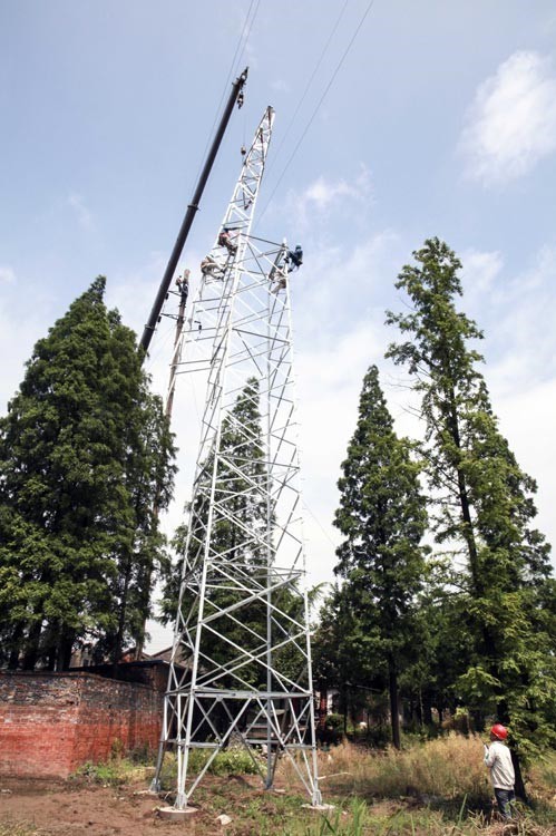 5月27日,江蘇泰州安泰輸變電工程有限公司工作人員正在35千伏口港線88號-90號改造現場組立鐵塔。 35千伏口港線工程肩負著泰州市高港區(qū)務港局和長江口岸閘口的供電任務。此線路已投運近20年,由于運行年限