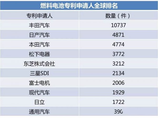 根據(jù)上??萍记閳笱芯克鶎θ剂想姵叵嚓P(guān)專利的檢索分析,燃料電池專利申請人全球排名中,日本豐田汽車以10,737個專利族居首,大幅領(lǐng)先競爭對手。在前十名的企業(yè)中,7家為日本企業(yè)。各企業(yè)掌握的專利數(shù)量差距較大,技術(shù)主要集中在排名前五的大公司手中。
