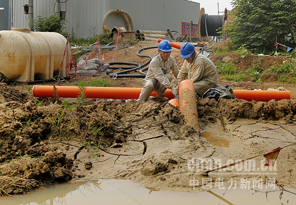 國網(wǎng)江蘇省電力公司邳州市供電公司組織30多名施工人員冒著36度的高溫在110千伏戴圩變電站至10千伏開關(guān)站開展敷設(shè)電纜和10千伏6回路線路架設(shè)
