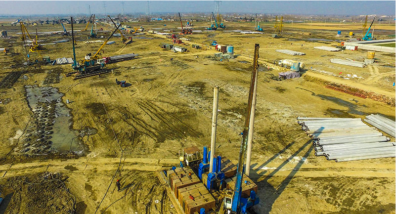 當(dāng)日,是直流換流站站址開工建設(shè)的第35天,經(jīng)過工程建設(shè)者們的辛勤勞動,已基本完成場地平整工作,順利進(jìn)入路面澆筑、基礎(chǔ)打樁階段。