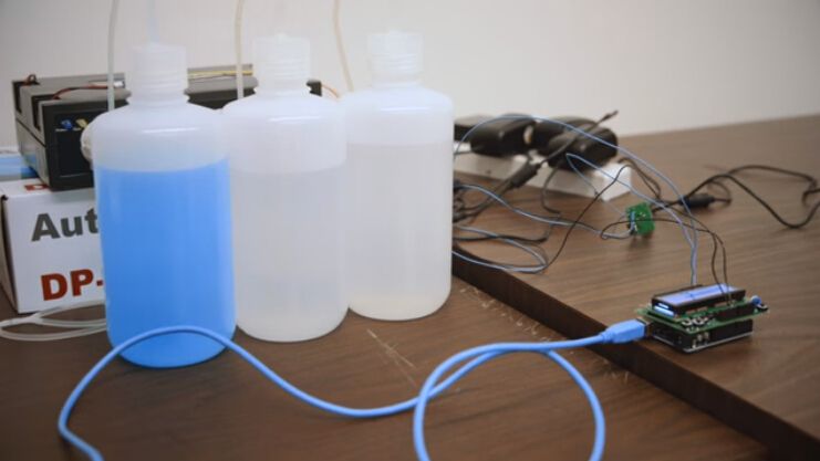 斯坦福大學(xué)的這套化學(xué)通信裝置在結(jié)構(gòu)上類似于其他電子通信裝置,但與這些設(shè)備依靠電信號發(fā)送指令有所不同,該裝置依靠醋(酸)和玻璃清潔劑(堿)的脈沖作為信息編碼方式。研究人員在電腦上輸入信息,由計(jì)算機(jī)將信號傳輸給一套裝置用于將信號解析為酸堿性脈沖,隨后醋(酸)和玻璃清潔劑(堿)的液體從該裝置流出,接收端容器帶有一個(gè) pH 傳感器,將傳輸過來的脈沖信號轉(zhuǎn)化為傳統(tǒng)的二進(jìn)制編碼,進(jìn)而由另一臺相連的計(jì)算機(jī)解碼并讀出信息。