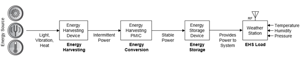 圖 1 顯示了能量收集系統(tǒng)的框圖。能量是由能量收集系統(tǒng) (如太陽能板)收集,并由電源管理集成電路(PMIC)轉(zhuǎn)換成穩(wěn)定的能量,再使用低漏、低阻抗的電容器儲存。這些能源能供給傳感器接口負載(譬如微控制器MCU),用來無線傳輸傳感器數(shù)據(jù)。本圖中,能量收集系統(tǒng)(EHS)是無線傳感器節(jié)點。