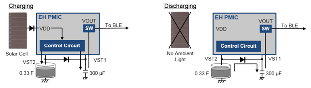 首先,PMIC儲存太陽能到存儲設備 VSTORE1(VST1),此例中為一個 300-μF 的陶瓷電容器。當 VST 1 達到 VOUTH V,能量就可以傳輸?shù)?MCU 。但這個簡單的能量收集設計不能全日運作,原因是沒有備份電容器。讓我們來看看,備份電容器如何加配到 PMIC 設備,和電容器能夠如何支持 MCU。