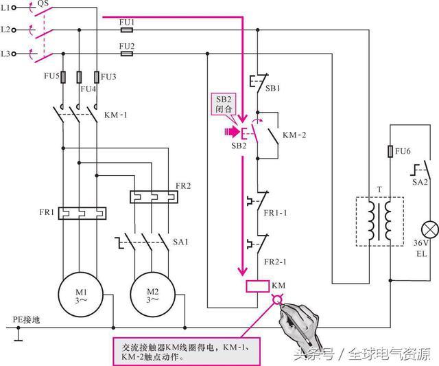 交流接觸器KM線圈得電后,常開輔助觸點KM-2閉合自鎖,使KM線圈保持得電。常開主觸點KM-1閉合,電動機M1接通三相電源,開始運轉。