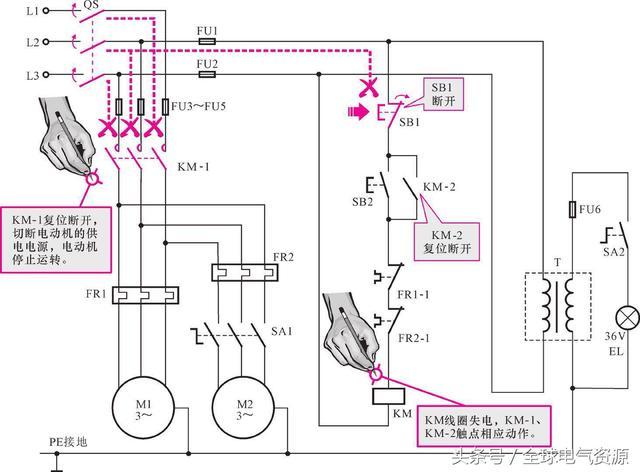 常開主觸點KM-1復位斷開,切斷電動機供電電源,電動機停止運轉。