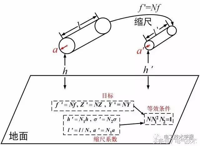 基于電磁場原理,考慮導(dǎo)線趨膚效應(yīng),導(dǎo)出了傳輸線的縮尺等效條件:縱向縮尺系數(shù)1/N、橫向縮尺系數(shù)N1以及導(dǎo)線電導(dǎo)率縮尺系數(shù)N2滿足NN12N2=1。在對架空輸電線路的實(shí)際應(yīng)用中,選取導(dǎo)線材料(電導(dǎo)率)不變(N2=1),橫向縮尺系數(shù)為縱向縮尺比例的平方根(N1=(1/N)1/2),可兼顧縱向和橫向尺寸,使得縮尺后的線路尺寸易于工程實(shí)現(xiàn)。