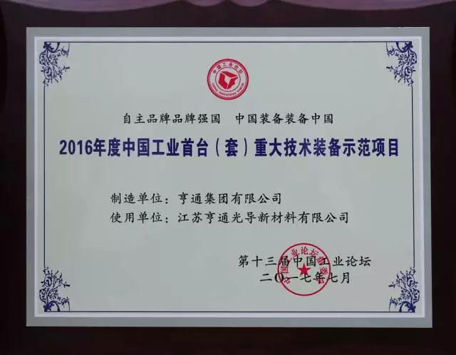 亨通獲評中國工業(yè)首臺(套)重大技術裝備示范項目