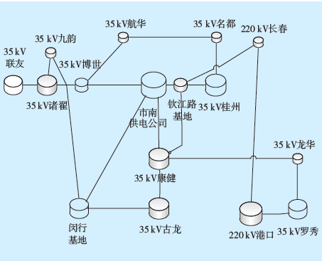 以國網(wǎng)上海電力所轄的閔行—徐匯地區(qū)骨干網(wǎng)(四級網(wǎng)部分)為例進行分析,該區(qū)域處于上海市核心區(qū)域,尤其是在徐匯區(qū)范圍內(nèi),大多數(shù)站點為較老站點,骨干網(wǎng)架構(gòu)如圖1所示。
