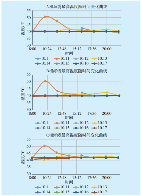 2016年10月10日—17日,現(xiàn)場人員每2 h通過海底電纜溫度在線監(jiān)測系統(tǒng)記錄了海南聯(lián)網(wǎng)系統(tǒng)三相海底電纜導(dǎo)體溫度的情況(見圖2、3)。