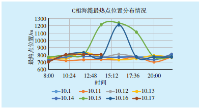 圖10 2016年10月15日C相海底電纜最熱點位置變化Fig.10 The change of the hottest pot position of phase C about submarine cable on Oct. 15, 2016