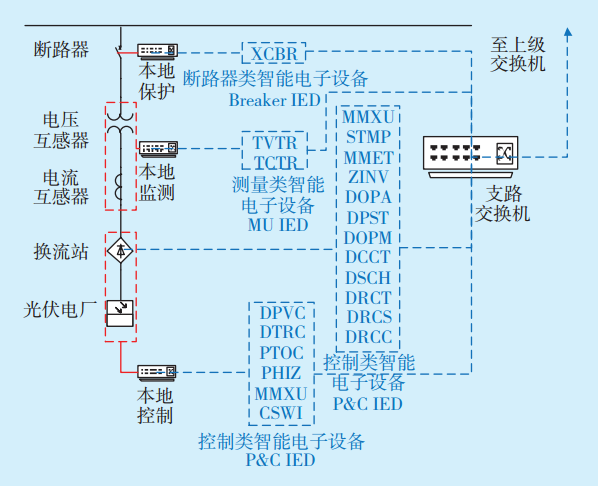 1)IEC61850標(biāo)準(zhǔn)將變電站劃分為過程層、間隔層和變電站層。過程層主要包括智能組件、智能終端元件和合并單元類設(shè)備;間隔層主要包括穩(wěn)控裝置、測控裝置、繼電保護(hù)裝置和故障錄波裝置等;變電站層設(shè)備則主要包括工程師工作站、操作員站監(jiān)控主機(jī)、數(shù)據(jù)服務(wù)器、數(shù)據(jù)通信網(wǎng)關(guān)、綜合應(yīng)用服務(wù)器等。微網(wǎng)數(shù)據(jù)建模同樣需要按照設(shè)備功能的不同劃分為3個層次[8]
