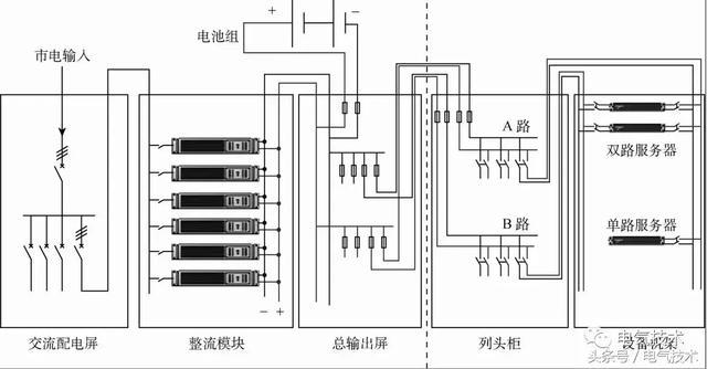 圖4為240V高壓直流供電系統(tǒng)圖(通信行業(yè)標準YD/T 2378-2011圖A.1)。由圖中可以看出,電池組經(jīng)熔斷器與整流模塊輸出端在總輸出屏構(gòu)成輸出母排,系統(tǒng)兩路輸出(A路和B路),通過列頭柜配電,來滿足雙電源服務(wù)器的需求,而單電源服務(wù)器僅使用A路或B路。