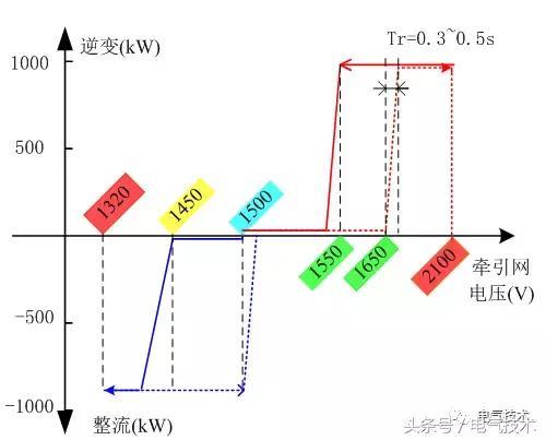 綜上分析,考慮到列車吸收、接觸網(wǎng)阻抗以及避免與整流機(jī)組構(gòu)成環(huán)流,一般回饋啟動(dòng)電壓點(diǎn)設(shè)置為1700左右。考慮到裝置不會(huì)頻繁啟動(dòng)整流功能,將整流啟動(dòng)電壓點(diǎn)設(shè)定為1500V,在列車牽引時(shí),將下垂的電壓拉回至1500V。
