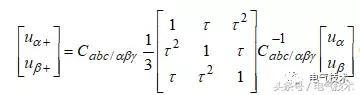 基于d-q變換的改進(jìn)數(shù)字鎖相環(huán)如圖5所示,DSP先對三相電壓采樣值ua(k)、ub(k)和uc(k)進(jìn)行3s/2s變換處理得到uα和uβ,按等功率Clarke變換可得三相電壓在兩相靜止坐標(biāo)系下正序分量[12]: