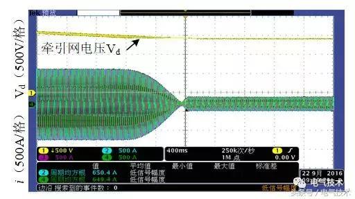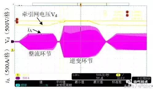 因電壓環(huán)退積分速度和輸出限幅,裝置需要一段時(shí)間才能轉(zhuǎn)入整流狀態(tài)。牽引網(wǎng)電壓逐漸恢復(fù)到大整流停止點(diǎn)以上,大整流停止,整流電流逐漸遞減至小整流電流值,維持牽引網(wǎng)電壓平衡。