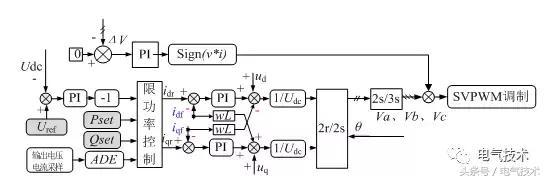圖3中網(wǎng)絡(luò)標(biāo)識符說明:Uref電壓環(huán)給定值,Udc為母線電壓反饋值,ΔV為正負(fù)母線電壓差;Sign(v*i)為三相調(diào)制波分別和該相電流乘積正負(fù)符號;Va、Vb、Vc為三相調(diào)制波;Sa1~Sc4為驅(qū)動(dòng)信號;Pset和Qset為有功功率和無功功率設(shè)置值;ADE指電能芯片負(fù)載輸出有功和無功采樣并傳送給控制芯片,用于限功率控制;id_island\iq_island為孤島擾動(dòng)給定;id_dc\iq_dc為直流分量控制給定;idr和iqr為限功率控制后的電流環(huán)dq給定;idf和iqf為電感電流反饋dq值;wL為電流d值和q值之間的解耦系數(shù)(w為角速度);ud和uq為電壓前饋dq值;uqr為鎖相環(huán)給定值。