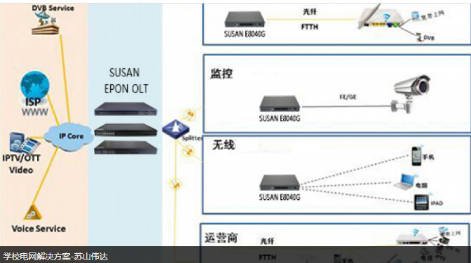 學(xué)?;A(chǔ)網(wǎng)絡(luò)建設(shè)包括學(xué)校的監(jiān)控系統(tǒng)、廣播系統(tǒng),無線WIFI覆蓋,蘇山偉達公司主要采用PON(無源光網(wǎng)絡(luò))接入解決方案。