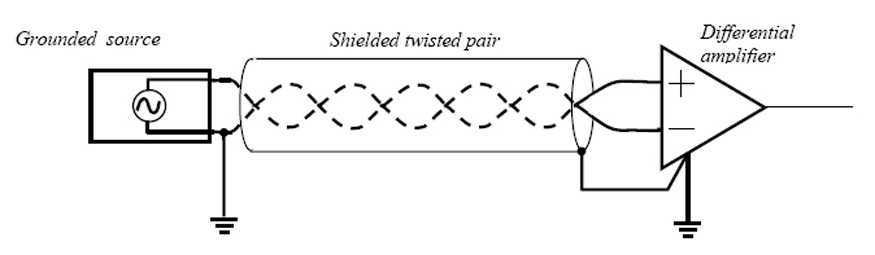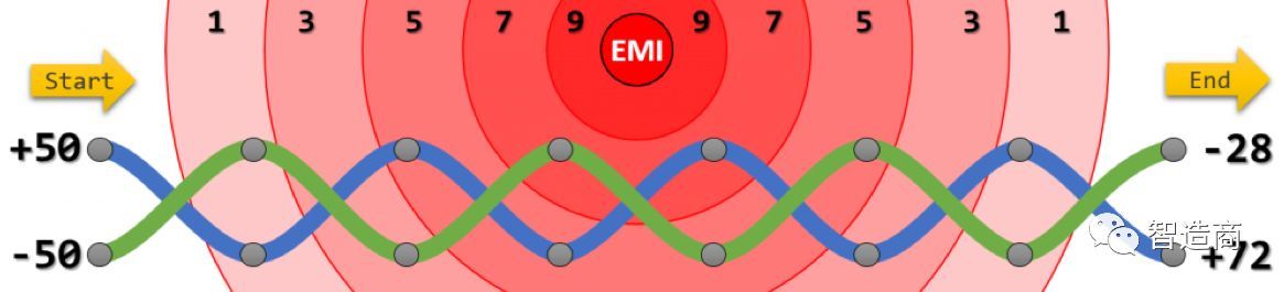 噪聲源通過(guò)電場(chǎng)或磁場(chǎng)的耦合將噪聲引入到導(dǎo)線(xiàn)中,并傾向于均等地同時(shí)耦合到兩條彼此扭曲的導(dǎo)線(xiàn)上。 這樣一來(lái),噪聲就會(huì)在雙絞線(xiàn)上產(chǎn)生一組共模的信號(hào)。由一條導(dǎo)線(xiàn)產(chǎn)生的干擾/噪聲將會(huì)與另一根導(dǎo)線(xiàn)產(chǎn)生的干擾/噪聲相互抵消,因?yàn)樗鼈儽举|(zhì)上是大小相等且方向相反的,當(dāng)差分信號(hào)被接收時(shí),在接收器處就會(huì)被消除掉,最終得到純凈的沒(méi)有干擾的信號(hào)。