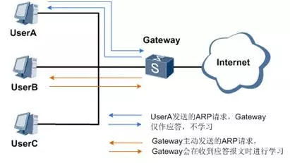 通常情況下,當UserA向Gateway發(fā)送ARP請求報文后,Gateway會向UserA回應(yīng)ARP應(yīng)答報文,并且添加或更新UserA對應(yīng)的ARP表項。當Gateway配置ARP表項嚴格學習功能以后: