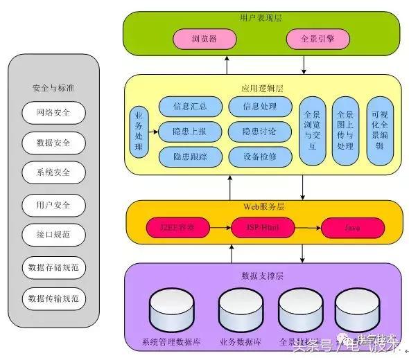 在橫向上,基于全景的輸電線路可視化運(yùn)維管理需要滿足安全與標(biāo)準(zhǔn)體系的要求,包括數(shù)據(jù)存儲(chǔ)與傳輸規(guī)范、接口規(guī)范、網(wǎng)絡(luò)安全、數(shù)據(jù)安全、系統(tǒng)安全、用戶安全等(圖1為基于全景的輸電線路可視化運(yùn)維管理的總體框架)。