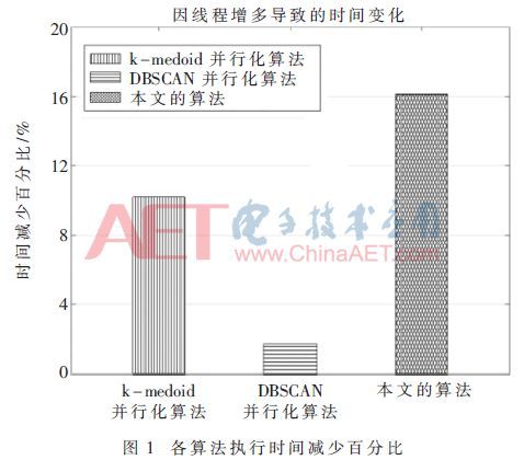 由圖1可知,k-medoids并行化算法減少了10.20%,DBSCAN并行化算法減少了1.68%,本文算法減少了16.13%,說明本文算法在線程數(shù)增加時(shí),可以更有效地減少運(yùn)算時(shí)間,提高執(zhí)行效率。