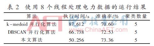 由表2可得,使用8個(gè)線程時(shí),本文算法比k-medoids并行化算法執(zhí)行時(shí)間快了42.64%,比DBSCAN并行化算法快了24.70%。