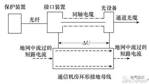 如圖3所示,當(dāng)線路接地時,變電站地網(wǎng)中將流過接地電流,當(dāng)此電流通過通信機(jī)房內(nèi)的環(huán)形等電位接地網(wǎng)時,會在環(huán)形等電位接地網(wǎng)上產(chǎn)生壓降?U,而通信機(jī)房內(nèi)的光設(shè)備屏和接口裝置屏之間的同軸電纜的屏蔽層是通過各自的屏柜接到環(huán)形接地母線上的,因此該?U實(shí)際上是加到了同軸電纜的屏蔽層上。同軸電纜的屏蔽層,是有為信號提供電氣通路的功能的,疊加?U后,將可能導(dǎo)致通信信號發(fā)生畸變,使通道發(fā)生異常。