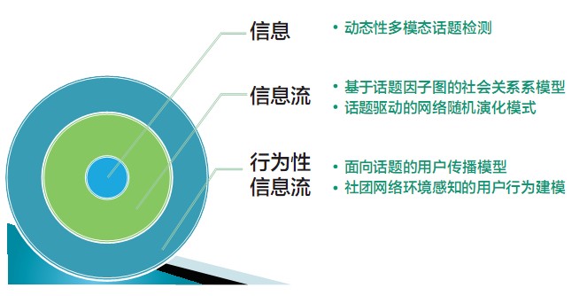 楊士強(qiáng)教授給出了信息→信息流→行為性信息流的新挖掘思路。在信息層面, 通過內(nèi)容理解, 進(jìn)行信息內(nèi)容的語義挖掘; 在信息流層面, 進(jìn)行結(jié)構(gòu)分析, 進(jìn)行信息傳播的結(jié)構(gòu)挖掘及演化規(guī)律挖掘; 在行為性信息流層面,通過行為建模, 進(jìn)行用戶偏好挖掘 (如圖) 。