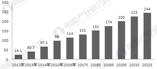 2012-2022年全球大數(shù)據(jù)軟件市場規(guī)模及預測(單位:億美元)