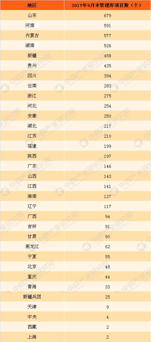 2017年9月末中國各地區(qū)PPP管理庫項目數(shù)量統(tǒng)計