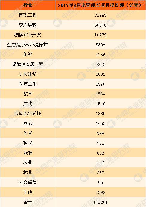 2017年9月末中國各行業(yè)PPP管理庫項目投資額統(tǒng)計