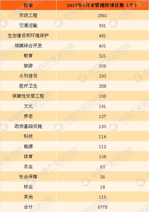 截至2017年9月30日,中國各行業(yè)PPP管理庫項目數(shù)達(dá)到6778個。其中,市政工程、交通運輸、生態(tài)建設(shè)和環(huán)境保護(hù)項目數(shù)居前三位,分別為2561個、931個和481個,合計占同口徑全國總數(shù)的58.6%。