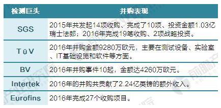 其他巨頭也不例外,2016年TüV投資金額達(dá)9280萬歐元,特別是在測試設(shè)備、實驗室、IT基礎(chǔ)設(shè)施和軟件等方面;BV并購金額達(dá)4260萬歐元;Intertek的收購貢獻了2.24億英鎊的額外收入,還有Eurofins2016年完成27個收購項目...
