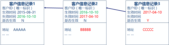 這種模式,我們在傳統(tǒng)的數(shù)據(jù)庫設(shè)計(jì)也會采用,例如下圖拉鏈表的形式,每次對數(shù)據(jù)的更新都采用追加( Insert而不是Update)模式,有起始時(shí)間、失效時(shí)間和是否生效標(biāo)識,保持全部交易歷史。