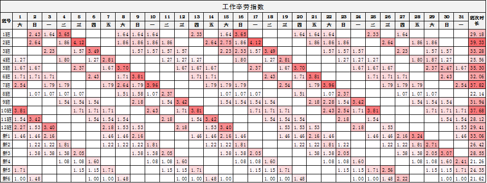 將一個自然月內(nèi)工作日班次時長疲勞指數(shù)與班組構成系數(shù)相乘之和得出各班的工作辛勞指數(shù),在表5中指數(shù)越高顏色越深。