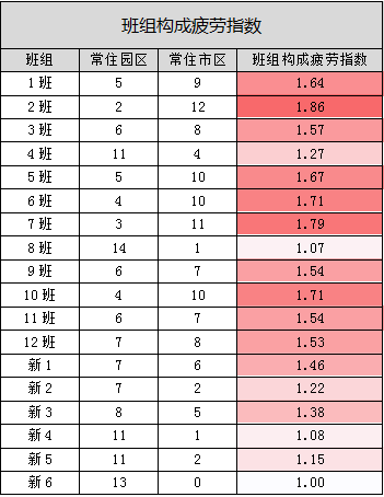 將一個自然月內(nèi)倒班次數(shù)與班組構成系數(shù)相乘之和得出各班的倒班辛勞指數(shù),在表6中指數(shù)越高顏色越深。