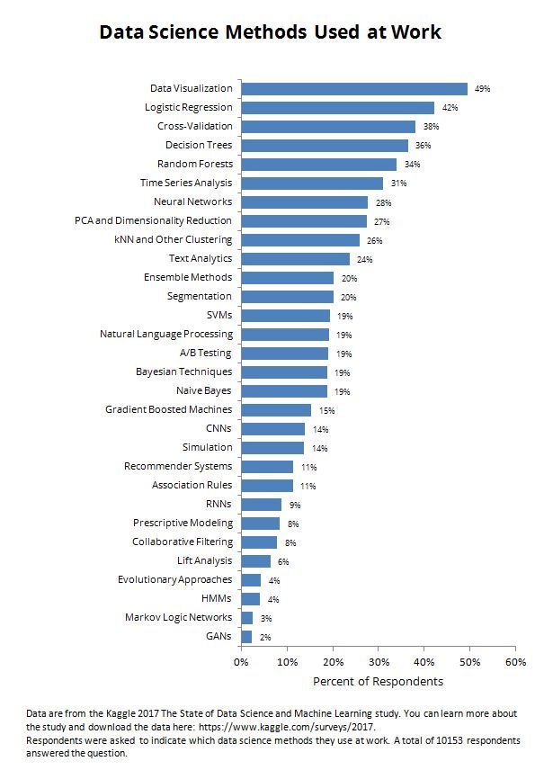 調(diào)查包括一個針對數(shù)據(jù)專業(yè)從業(yè)人員的問題,“在工作中,你經(jīng)常使用以下數(shù)據(jù)科學(xué)方法? (選擇所有使用的)”。平均而言,數(shù)據(jù)專家在2017年使用了5種(中值)數(shù)據(jù)科學(xué)方法。2017年使用的前5種數(shù)據(jù)科學(xué)方法是(見圖1):