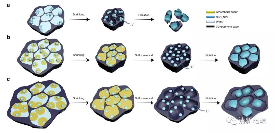 在目前引入預(yù)留空間的方法中,主要采用犧牲性模板如Si模板,Ni模板、PS球模板,鹽模板等,這些模板無論是原位還是非原位引入,最終都很難同非碳組分很好地結(jié)合且大多是形狀模板,引入的空隙為模板形狀導(dǎo)向,因此很難獲得合適的預(yù)留空間。硫模板法的提出,是在三維石墨烯致密網(wǎng)絡(luò)中,不僅利用其易去除的優(yōu)勢(shì),更為重要的是利用硫如同“變形金剛”一樣的可塑形的特點(diǎn),在碳籠結(jié)構(gòu)內(nèi)部實(shí)現(xiàn)對(duì)非碳活性顆粒如SnO2納米顆粒的緊密包覆。與傳統(tǒng)的形狀模板相比,硫模板的最大優(yōu)勢(shì)就是能發(fā)揮體積模板的作用,使緊致的石墨烯籠結(jié)構(gòu)能夠提供適形且大小合適的預(yù)留空間,最終完成對(duì)活性SnO2顆粒的“量體裁衣”。SnO2作為模型材料,能夠很好的詮釋可塑形硫模板的方法學(xué),同時(shí)該方法已推廣至硅及其他非碳電極,對(duì)于豐富非碳電極設(shè)計(jì)思想具有重要的啟發(fā)意義。