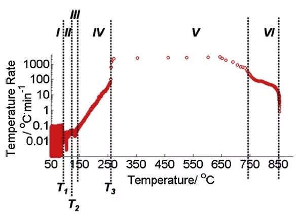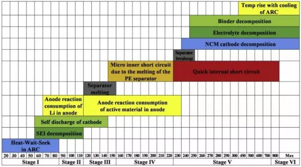 根據(jù)圖6所示三個(gè)特征溫度以及圖7所示各溫度點(diǎn)對(duì)應(yīng)的溫升速率,NMC電池ARC測(cè)試過(guò)程的熱失控可以劃分為6個(gè)階段: