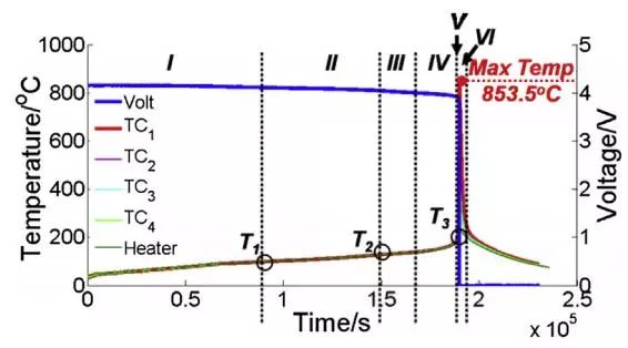 階段5:達(dá)到T3溫度,熱失控觸發(fā)。由于隔膜大面積熔化,大面積劇烈短路發(fā)生,同時(shí)伴隨著正極材料分解、電解液分解、粘結(jié)劑分解等劇烈反應(yīng)生成大量熱,很快達(dá)到最高溫度T4。一般將溫升速率大于1℃/s時(shí)對(duì)應(yīng)的溫度點(diǎn)定義為T3。