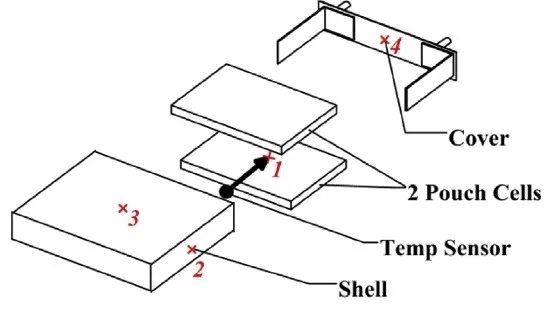 通過(guò)ARC可以對(duì)正、負(fù)極材料、電解液的熱反應(yīng)溫度、放熱量等進(jìn)行測(cè)試,可以對(duì)鋰離子電池正、負(fù)極材料、電解液的安全性進(jìn)行研究,分析導(dǎo)致鋰離子電池?zé)崾Э氐脑颉?duì)電解液中的碳負(fù)極進(jìn)行ARC試驗(yàn)可以研究SEI膜的熱分解。ARC除了能對(duì)電池組件材料進(jìn)行熱特性分析外,還能對(duì)不同型號(hào)、尺寸大小及用途的鋰離子電池進(jìn)行熱特性分析。清華大學(xué)汽車安全與節(jié)能國(guó)家重點(diǎn)實(shí)驗(yàn)室馮旭寧等人發(fā)表了國(guó)際上第一個(gè)采用ARC測(cè)試大容量動(dòng)力電池?zé)崾Э亓亢蜔嵫芯康慕Y(jié)果。他們采用ARC技術(shù)測(cè)試了25Ah的NMC/Gr電池,型號(hào)是厚度26mm的VDA規(guī)格,兩個(gè)電芯并聯(lián)結(jié)構(gòu),在電池內(nèi)部預(yù)埋了兩個(gè)熱電偶:一個(gè)在兩個(gè)卷心中間,一個(gè)在泄壓閥位置,另外再在電池殼體上安裝了兩個(gè)熱電偶,具體如圖5所示。