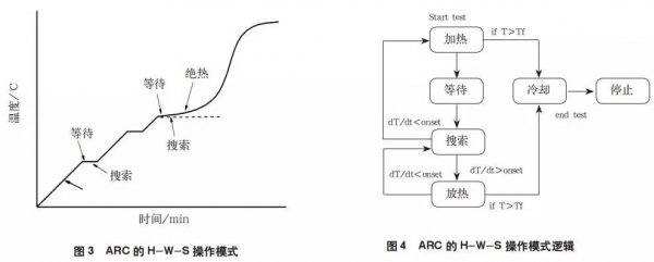ARC工作基本原理為加熱-等待-搜索(H-W-S)的模式(圖3)。用戶需給系統(tǒng)設(shè)定起始和終止溫度,溫度梯度值和靈敏度值。被測(cè)樣品將置于絕熱爐內(nèi)的樣品室,系統(tǒng)首先將樣品加熱到起始溫度,隨后進(jìn)入等待狀態(tài),目的是使樣品和量熱儀的溫度一致并達(dá)到一個(gè)熱平衡。等待期后,將進(jìn)入搜索模式,該模式下加熱器不供熱,系統(tǒng)通過(guò)對(duì)比升溫速率和預(yù)設(shè)的靈敏度(通常為0.02℃/min)來(lái)尋找是否有放熱,如升溫速率高于預(yù)設(shè)值,儀器將自動(dòng)進(jìn)入“放熱”狀態(tài),系統(tǒng)會(huì)把溫度、升溫速率和壓力數(shù)據(jù)記錄下來(lái),整個(gè)過(guò)程樣品始終處于絕熱狀態(tài),H-W-S操作模式邏輯見圖4。如果儀器沒(méi)有監(jiān)測(cè)到放熱反應(yīng),系統(tǒng)將自動(dòng)轉(zhuǎn)入加熱模式,根據(jù)溫度梯度值自動(dòng)升上一個(gè)溫度梯度,開始另一輪的“加熱-等待-搜索”,一直持續(xù)到設(shè)定的最終溫度或探測(cè)到放熱為止。
