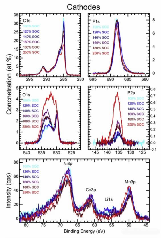 為了進(jìn)一步研究過(guò)充電對(duì)于NMC532材料結(jié)構(gòu)的影響,Javier Baren?o利用XPS對(duì)不同程度過(guò)充電后的電池材料進(jìn)行了分析,正極材料的主要變化體現(xiàn)在O1s和P2p兩個(gè)衍射峰的強(qiáng)度變化上,從O1s的衍射峰的強(qiáng)度變化上可以看到,材料中存在兩種類型的O,一種是530eV處所對(duì)應(yīng)的電負(fù)性更強(qiáng)的O,例如金屬氧化物中的氧以及NMC532中的氧,另外的一種就是533eV所對(duì)應(yīng)的電負(fù)性較弱的O,例如有機(jī)物中的O元素。從這兩種O的數(shù)量上來(lái)看,對(duì)于530eV對(duì)應(yīng)的電負(fù)性更強(qiáng)的O的數(shù)量在過(guò)充到180%SoC之前都沒(méi)有太大的變化,主要是在過(guò)充到250%后才出現(xiàn)了較大的增加,但是有機(jī)物中的O的含量隨著過(guò)充的程度提高而增加,表明在過(guò)充的過(guò)程中正極表面產(chǎn)生了較多的電解液分解產(chǎn)物。P2p峰主要對(duì)應(yīng)的電解液的分解產(chǎn)物P2O5,在過(guò)充后這一峰的強(qiáng)度發(fā)生了明顯的升高,表明正極表面的電解液分解產(chǎn)物增多,這與上面的O1s的分析結(jié)果一致。