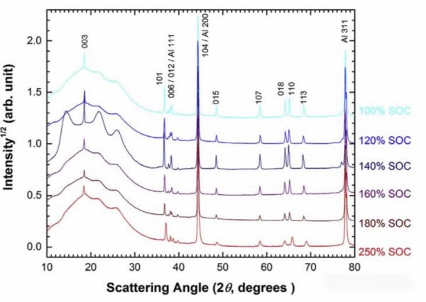 上圖為充電到不同SoC狀態(tài)后,然后放電到0%SoC的正極的XRD衍射圖譜,對(duì)比其他幾個(gè)衍射峰,我們驚奇的發(fā)現(xiàn),雖然這些正極都經(jīng)歷了不同程度的過(guò)充,但是正極材料的基本結(jié)構(gòu)并沒(méi)有遭到破壞,僅僅是衍射峰的寬度少有增加,意味著電池材料內(nèi)部產(chǎn)生了一定的應(yīng)力。