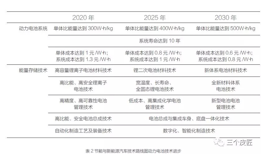 通過整理近期上市的騰勢(400)、北汽EU400、上汽榮威ERXEV400 等車型數(shù)據(jù)不難發(fā)現(xiàn),較老款車型新上市電動(dòng)車型動(dòng)力電池容量有較大增加。北汽EU 400 在保持售價(jià)與老款EU 260 基本持平的情況下,采用了孚能三元材料鋰電池,電池容量達(dá)到54.4 千瓦時(shí)(+31.4%),能量密度達(dá)到125Wh/kg,標(biāo)定續(xù)航里程360 公里(+38.5%),60km/h 等速行駛工況下續(xù)駛里程可達(dá)到460 公里;秦2017 款圖 2 電動(dòng)汽車保有量變化趨勢插電式混合動(dòng)力車型電池組容量達(dá)到17 千瓦時(shí)(較2015 款車型提高31%),純電動(dòng)續(xù)航里程達(dá)到100 公里(較2015 款車型提高43%)。表2 為《節(jié)能與新能源汽車技術(shù)路線圖》中動(dòng)力電池技術(shù)分階段發(fā)展目標(biāo),到2030 年動(dòng)力電池單體比能量Ⅴ 將達(dá)到500 瓦時(shí)/ 千克,是目前水平的2 倍以上 。