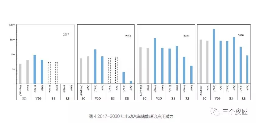 2.電動(dòng)汽車本身也可成為規(guī)??捎^且經(jīng)濟(jì)高效的儲(chǔ)能資源。電動(dòng)汽車可通過有序充電、V2G、電池更換、退役電池儲(chǔ)能等方式直接或間接參與電力系統(tǒng)儲(chǔ)能運(yùn)行,實(shí)現(xiàn)與固定儲(chǔ)能相同或相似的功能??紤]到未來電動(dòng)汽車較高市場滲透率,預(yù)計(jì)到2030年,其理論儲(chǔ)能規(guī)模遠(yuǎn)超抽水蓄能等其他儲(chǔ)能技術(shù)路線,有望解決當(dāng)前困擾可再生能源發(fā)展的電力系統(tǒng)小時(shí)級平衡問題。