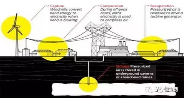 壓縮空氣儲能采用空氣作為能量的載體,大型的壓縮空氣儲能利用過剩電力將空氣壓縮并儲存在一個地下的結構(如地下洞穴),當需要時再將壓縮空氣與天然氣混合,燃燒膨脹以推動燃氣輪機發(fā)電。